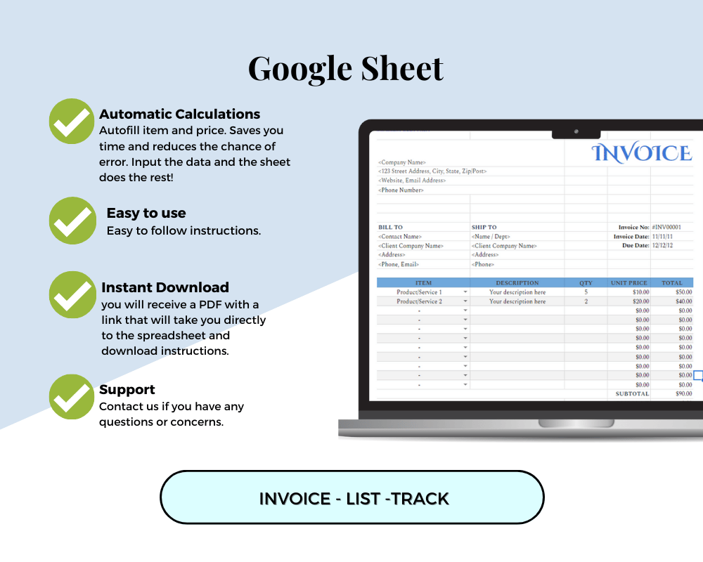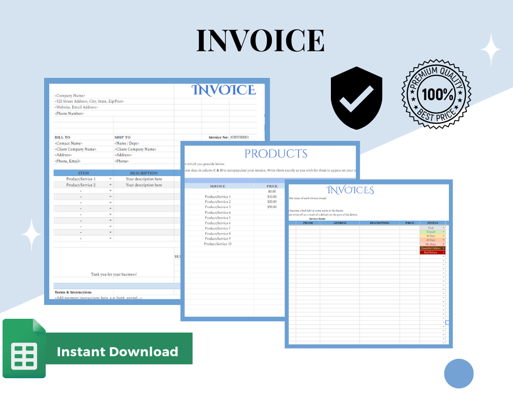 With this template, you'll have everything you need to stay on top of your invoicing and sales. The sheet will automatically fill in the pricing for you when you choose the item or service from the drop-down menu., and it allows you to easily track the status of the invoices you've sent, as well as the products and services you sell.