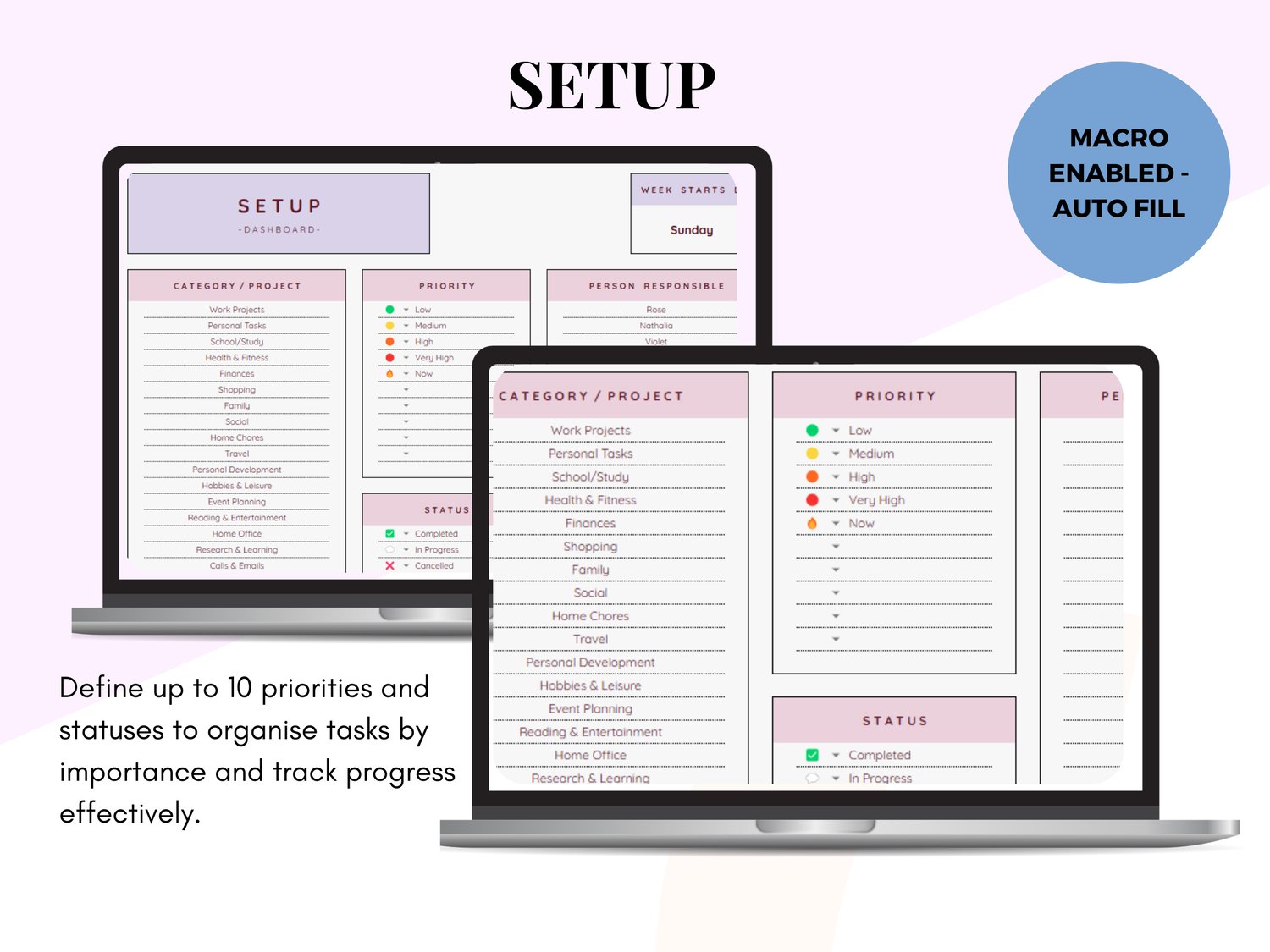 - Customisable categories and status options to tailor the spreadsheet to your project needs